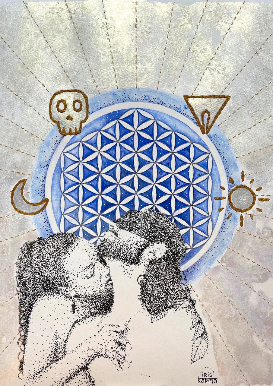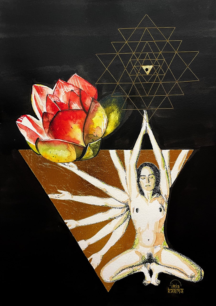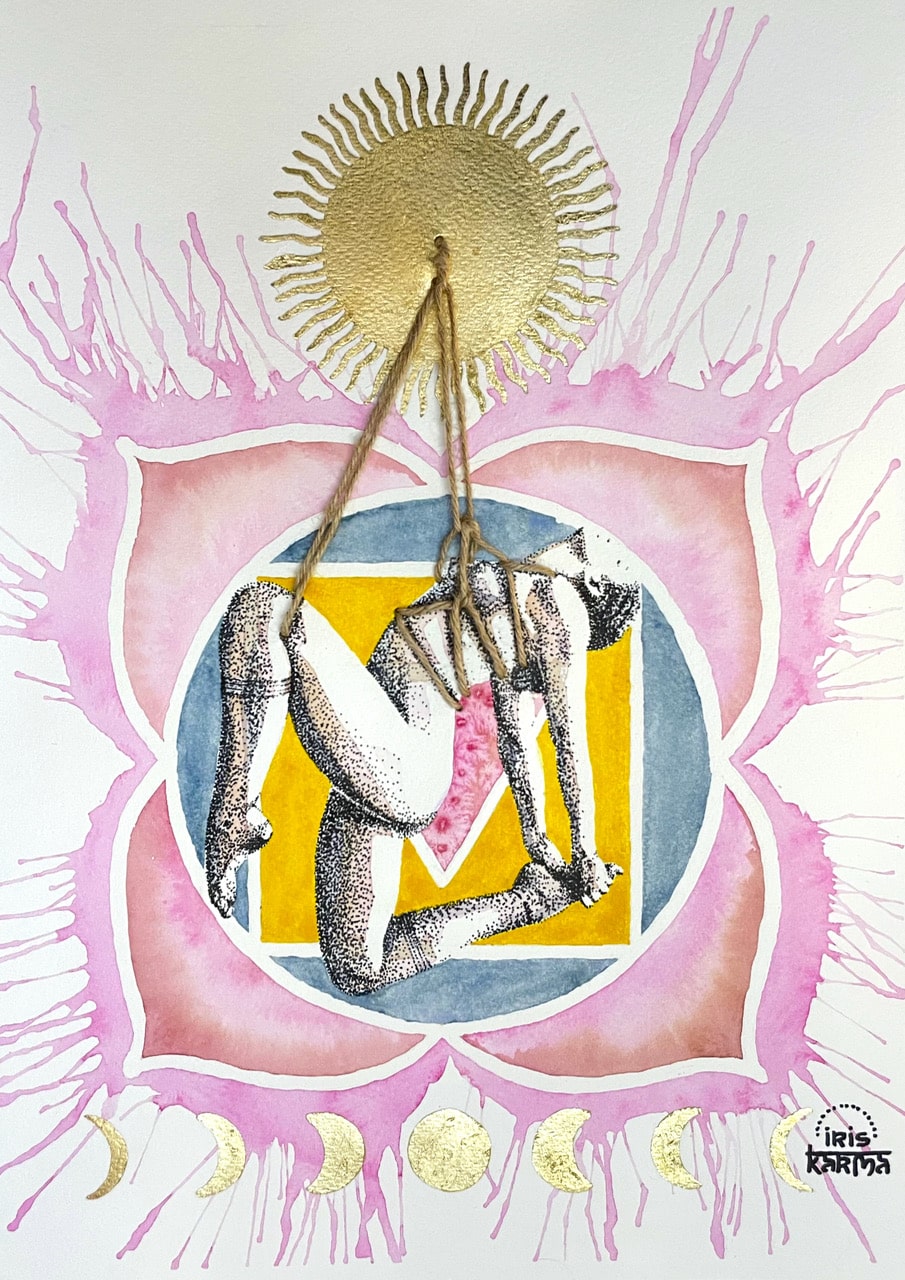 Iris Karma explore la sensualité sacrée à travers des créations mêlant aquarelle, feuille dorée, pointillisme et broderie. Chaque pièce commence par un tirage de cartes intuitif et se construit lentement, comme une méditation dans la matière.
