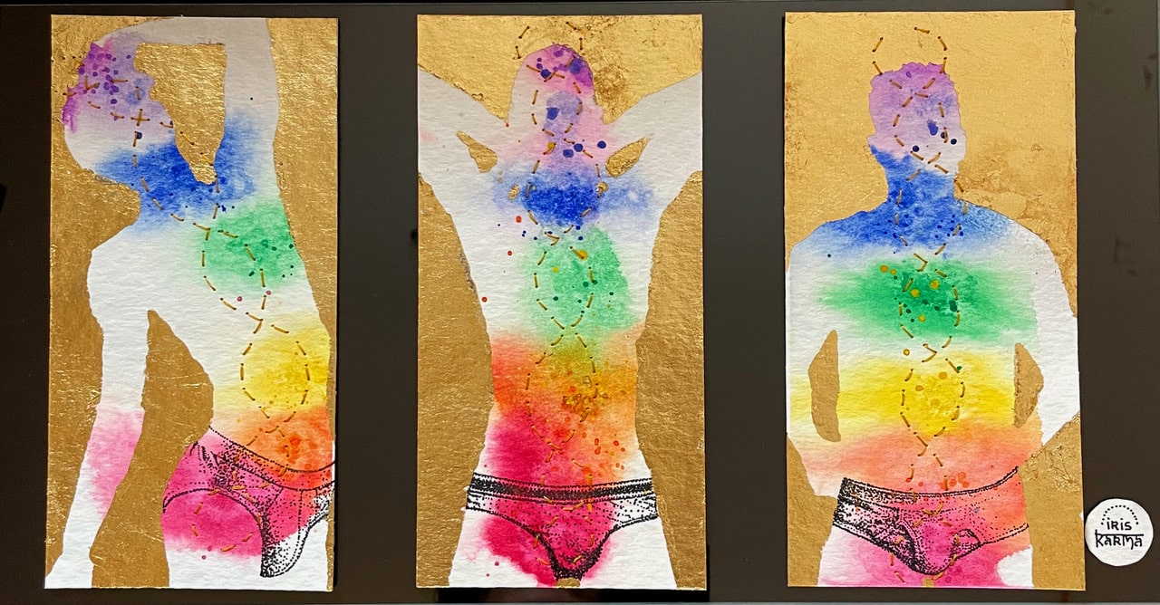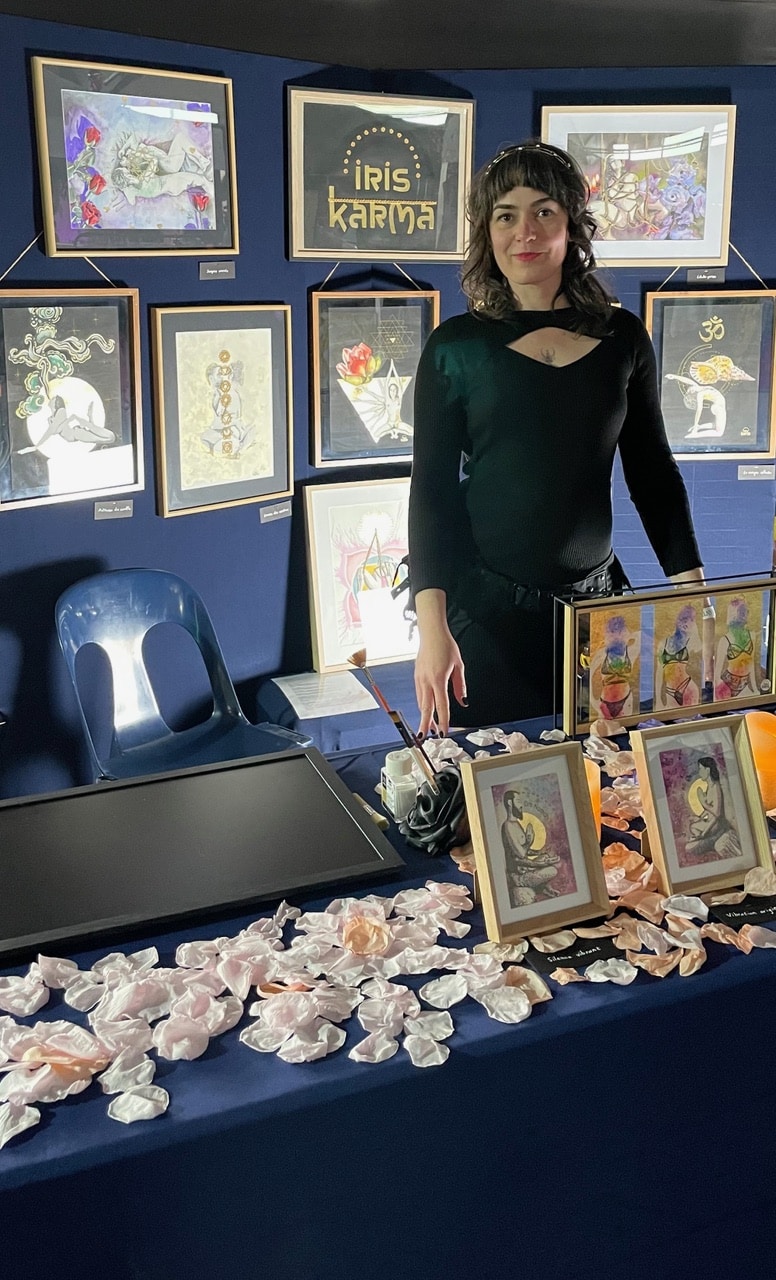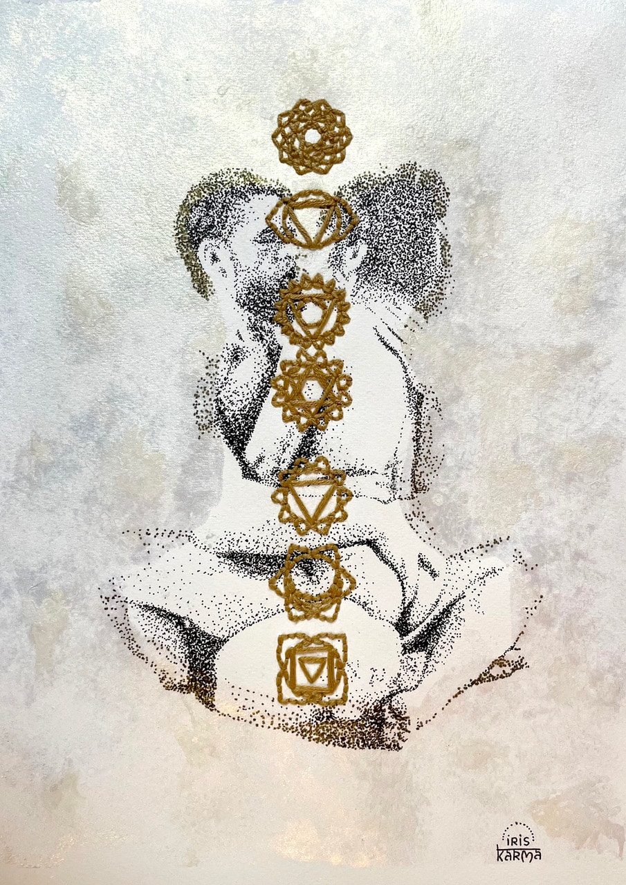 Iris Karma explore la sensualité sacrée à travers des créations mêlant aquarelle, feuille dorée, pointillisme et broderie. Chaque pièce commence par un tirage de cartes intuitif et se construit lentement, comme une méditation dans la matière.